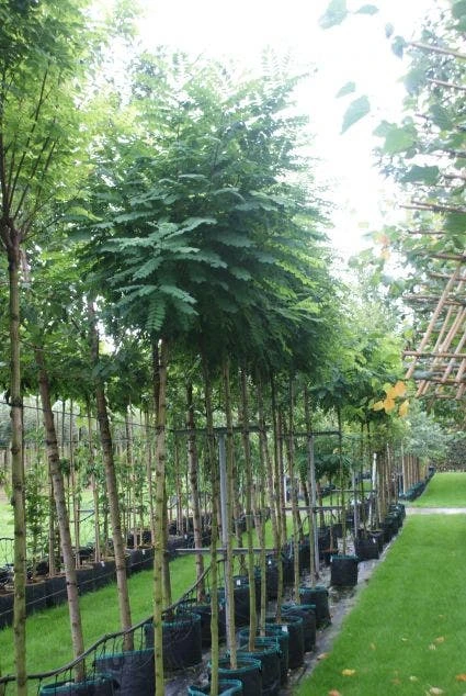 Robinia pseudoacacia ‘Umbraculifera’ (bolacacia) is een bekende en compact groeiende bolboom. Heeft mooi sierlijk geveerd blad. De kroon blijft compact en bolvormig door ieder jaar, na de nachtvorsten, de boom te snoeien (knotten). Loopt laat in het voorjaar uit, maar houdt ook lang het blad vast in het najaar. Bloeit niet bij regelmatige snoei.