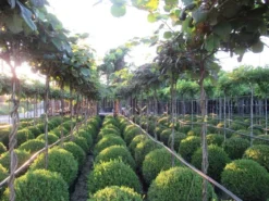 Actinidia chinensis (kiwiplant) is een hele bijzonder optie om te gebruiken als dakboom. Voor deze dakboom zijn twee kiwiplanten geleid als parasolvorm, die begint op 180cm hoogte. Door de gebruikte kweekvarianten is geen extra bestuiver meer nodig. Hiervoor zijn Actinidia Hayward (vrouwelijk) en Actinidia Tomuri (mannelijk) gebruikt. Kiwi’s geven de voorkeur aan een zonnige en enigszins beschutte standplaats. Hoe meer zon de kiwi’s krijgen, hoe beter de smaak.