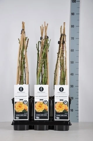 Rosa ‘Moonlight’ (geel-oranje klimroos) is een gezonde, geurende klimroos met gezond blad. De grote, gevulde citroengele bloemen worden ongeveer 12cm in doorsnede. Rosa ‘Moonlight’ wordt ongeveer 250cm hoog en ongeveer 100cm breed en wordt geleverd in vierkante pot met een inhoud van 3 liter en 3 stokken.