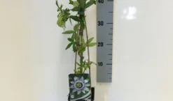 Passiebloem (Passiflora caerulea) is een klimplant met prachtige bloemen, de Passiebloem Caerulea heeft een melkwitte bloem, met een lila/blauwe kroon en groen/paarse stampers. De Passiebloem caerulea is, net als andere soorten uit de Passiflora familie, een goede klimmer die met de jonge scheuten zich om de leidraad, pergola, of takken van andere planten wikkelt en zich na voldoende houvast met grotere scheuten om deze houvast hecht. De Passiebloem caerulea heeft een standplaats nodig met volop zon, en zal zijn zonnige plek belonen met een uitbundige bloei. De passiebloem kan tot 3 meter hoog worden. Bij gebruik langs een schutting of andere afscheiding is het aan te raden 3 planten per strekkende meter te gebruiken om een mooi vol resultaat te bereiken. De Passiebloem (Passiflora caerulea) is de meest winterharde uit de Passiflora familie en kan alleen bij temperaturen lager dan -12 graden Celsius invriezen. Het kan gebeuren dat bij lagere temperaturen de plant tot dicht boven de grond invriest. De wortels zullen echter pas bij strenge- tot zeer strenge vorst kunnen invriezen. Dit kunt u voorkomen door bij vorst de grond om de plant af te dekken. De Passiebloem caerulea is echter een goede groeier, en zal snel weer mooi in bloei staan.