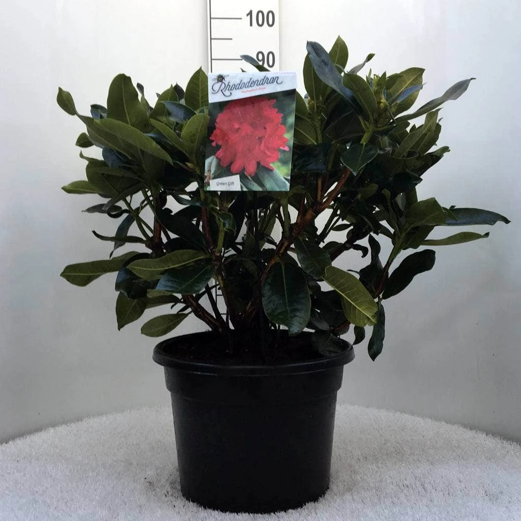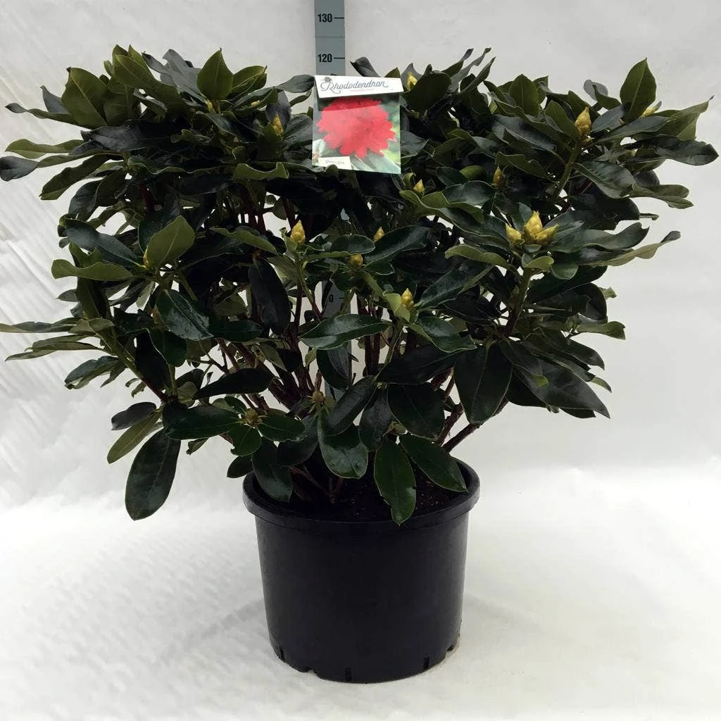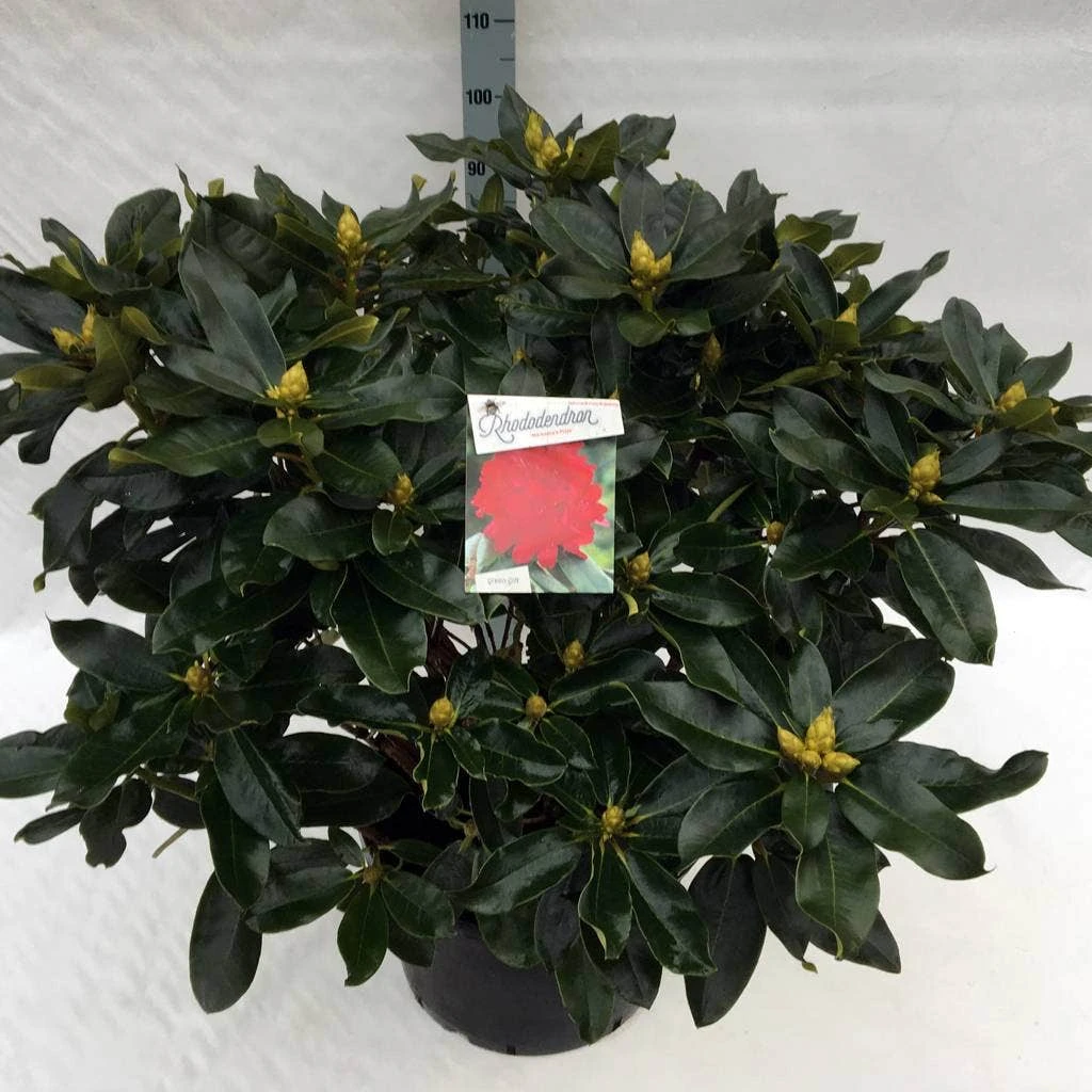 Rhododendron ‘Markeeta’s Prize’ krijgt een felrode bloem.