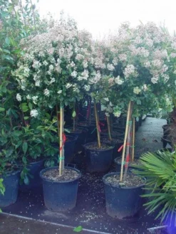 Het gaat hier om de Viburnum tinus ‘Eve Price’ op stam. De vermelde maten zijn stamhoogtes.