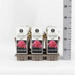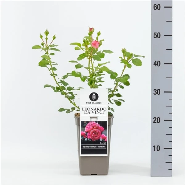 Rosa ‘Leonardo da Vinci’ is een trosroos rijk bloeit met licht geurende dubbele komvormige roze bloemen. Het is een sterke Floribunda roos met vrij donker blad.