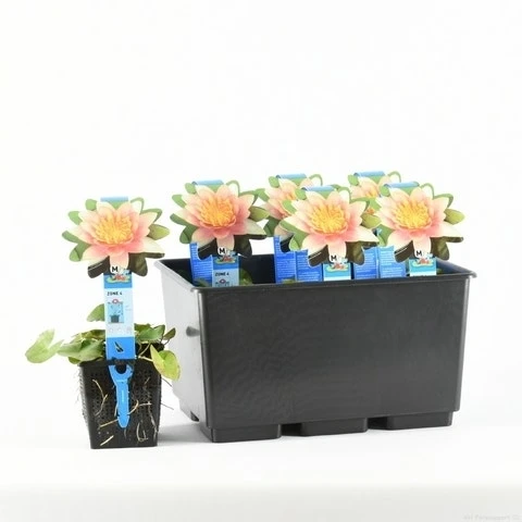 Nymphaea ‘Aurora’ is een waterlelie die oranje-roze bloeit van juli tot september. Jong blad krijgt paarse vlekken en verkleurt naar donkergroen.