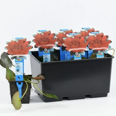 Nymphaea ‘Escarboucle’ is een rijk bloeiende waterlelie met rode, stervormige bloemen, van juni tot september. Heeft grote bladeren die brons uitlopen en vervolgens verkleuren naar donkergroen. Waterlelies staan graag op een zonnige plek.