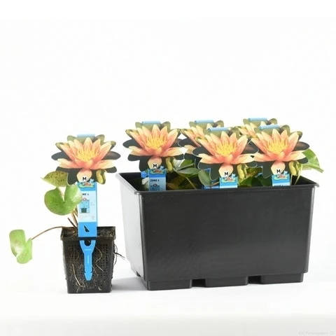 Nymphaea ‘Sioux’ is een rijk bloeiende waterlelie met oranje, stervormige bloemen, van juni tot september. Het grote blad verkleurt van paarsrood naar groenbruin. Waterlelies staan graag op een zonnige plek.